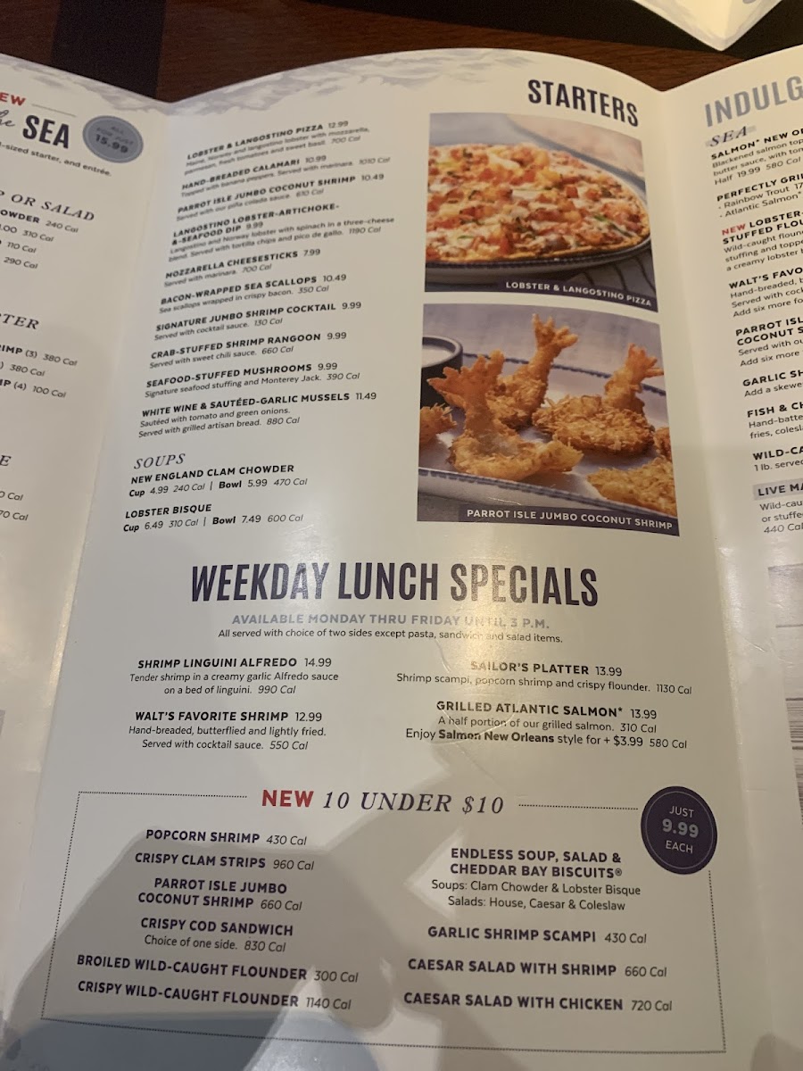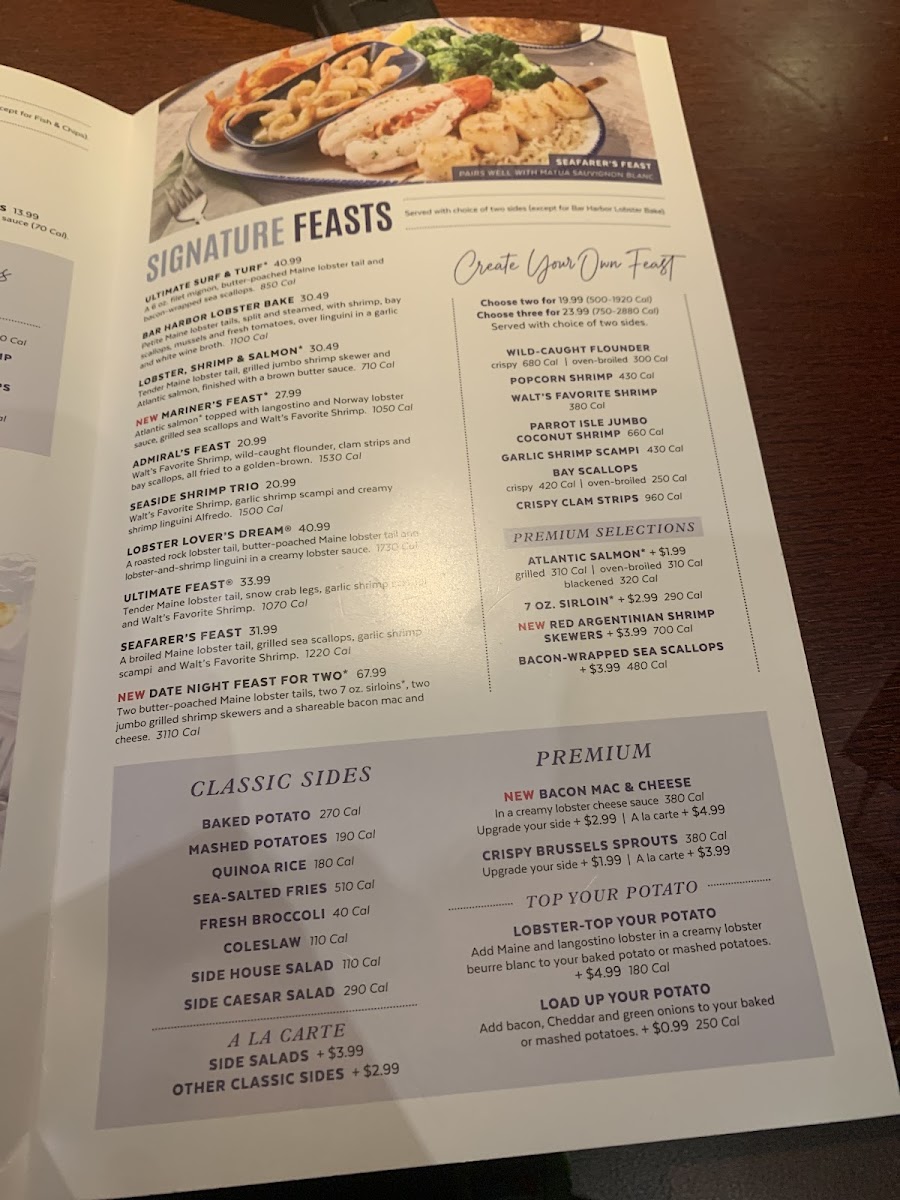 Snow Crab Legs, Grilled Sea Scallops, Maine Lobster Tail, Atlantic Salmon, 7 Oz. Sirloin, Walts Favorite Shrimp, Grilled Shrimp, Garlic Shrimp Scampi, Parrot Isle Jumpo Coconut Shrimp, Shrimp Linguini Alfredo